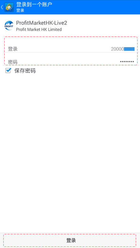 2.选择“登录一个已有账户”,搜索输入框内输入汇富宝的服务器“ProfitMarketHK-Live2”, 如图所示。