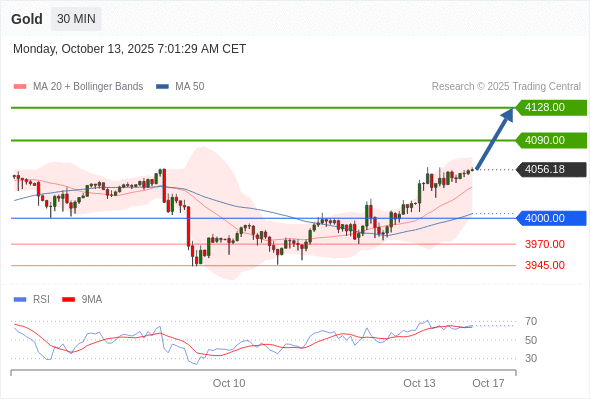 在 4000.00 之上,看涨,目标价位为 4090.00 ,然后为 4128.00 。